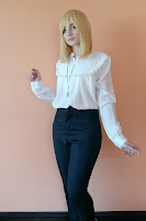 The shirt is my favourite piece of this costume. It's made out of chiffon fabric and I love it! It's very light and it feels very comfortable to wear. The shirt is quite baggy, which is perfect for howl. It's long enough and it's carefully sewn, so the fabric doesn't fray. The ruffles look adorable and the top part is lined, so no one can see your binder or bra or whatever you want to wear under the shirt! The shirt also has adorable little buttons that look like peals.